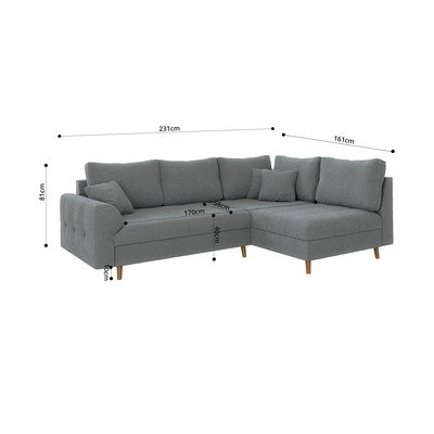 - cu tapițerie din țesătură bouclé, cu colț pe partea dreaptă/în formă de ”L”, gri, cu 3 locuri, lățime 231 cm