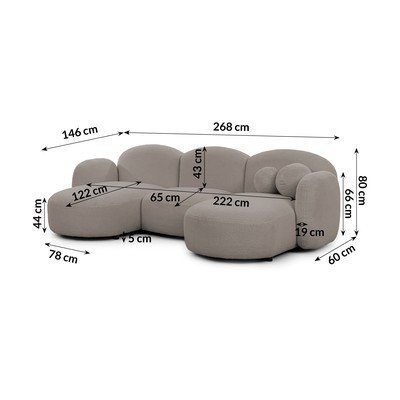 - cu tapițerie din țesătură bouclé, în formă de "U", gri, rezistent la apă/rezistent la pete, cu 4 locuri, lățime 268 cm