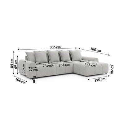 - cu colț pe partea dreaptă/cu șezlong, gri deschis, rezistent la apă/rezistent la pete, cu 4 locuri, lățime 306 cm