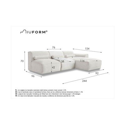 - cu colț pe partea dreaptă/cu șezlongGri deschisCu 3 locuriLățime 244 cmAdâncime 154 cmAdâncime șezut 58 cm