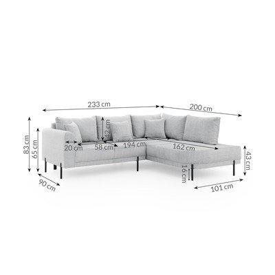 - cu tapițerie din chenilleCu colț pe partea dreaptă/în formă de ”L”Gri deschisPotrivit pentru animale de companie/rezistent la peteCu 4 locuriLățime 233 cm