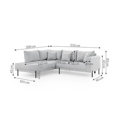 - cu tapițerie din chenilleCu colț pe partea stângă/în formă de ”L”Gri deschisPotrivit pentru animale de companie/rezistent la peteCu 4 locuriLățime 233 cm