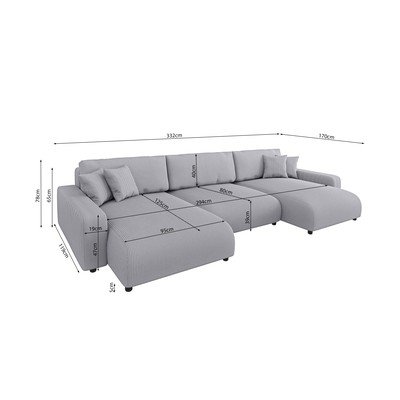 Colțar Sara- cu tapițerie din catifea reiată , extensibil/cu spațiu de depozitare, în formă de "U", gri deschis, cu 5 sau mai multe locuri, lățime 332 cm