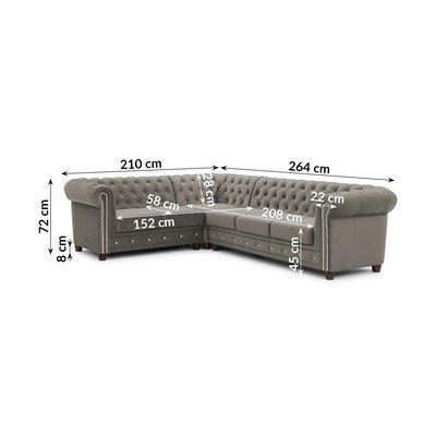 - cu tapițerie din catifeaExtensibilChesterfieldCu colț pe partea stângă/în formă de ”L”GriRezistent la apă/rezistent la peteCu 4 locuriLățime 264 cm