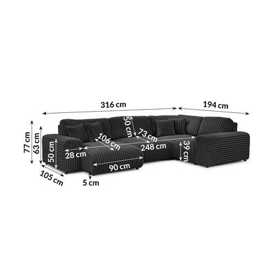 - cu tapițerie din catifea reiată Cu colț pe partea dreaptă/în formă de "U"Gri închisRezistent la apă/rezistent la peteCu 4 locuriLățime 316 cm