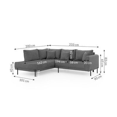 - cu tapițerie din chenilleCu colț pe partea stângă/în formă de ”L”Gri închisPotrivit pentru animale de companie/rezistent la peteCu 4 locuriLățime 233 cm