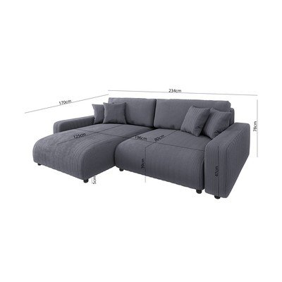 Colțar Sara- cu tapițerie din catifea reiată , extensibil/cu spațiu de depozitare, cu colț pe partea dreaptă/cu colț pe partea stângă/cu colț variabil/cu șezlong, gri închis, cu 3 locuri, lățime 234 cm