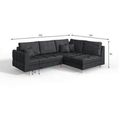 - cu colț pe partea dreaptă/în formă de ”L”, gri închis, cu 3 locuri, lățime 231 cm
