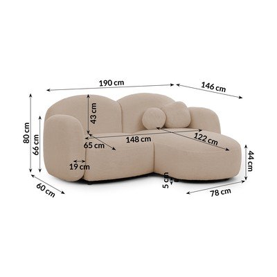 - cu tapițerie din țesătură boucléCu colț pe partea dreaptă/cu șezlongMaro deschisRezistent la apă/rezistent la peteCu 2 locuriLățime 190 cm