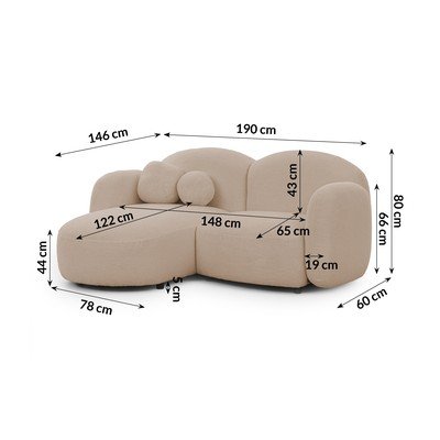- cu tapițerie din țesătură boucléCu colț pe partea stângă/cu șezlongMaro deschisRezistent la apă/rezistent la peteCu 2 locuriLățime 190 cm