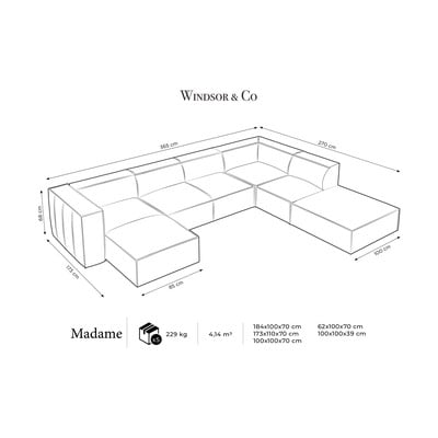 Colțar Madame- cu tapițerie din piele, cu colț pe partea dreaptă/în formă de "U", maro închis, rezistent la apă, cu 5 sau mai multe locuri, lățime 365 cm