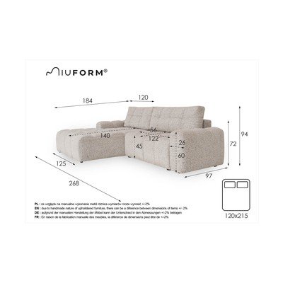 - extensibil/cu spațiu de depozitareCu colț pe partea stângăCremCu 3 locuriLățime 268 cmAdâncime 184 cmAdâncime șezut 56 cm