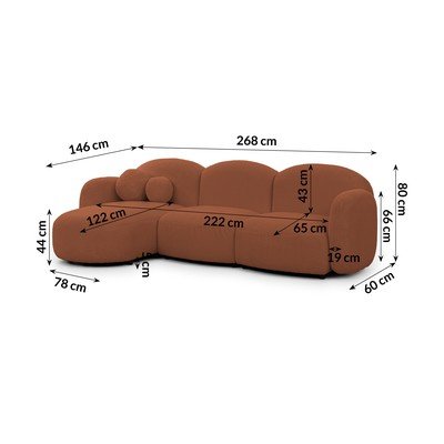 - cu tapițerie din țesătură boucléCu colț pe partea stângă/cu șezlongTeracotăRezistent la apă/rezistent la peteCu 4 locuriLățime 268 cm