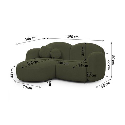 - cu tapițerie din țesătură boucléCu colț pe partea stângă/cu șezlongVerdeRezistent la apă/rezistent la peteCu 2 locuriLățime 190 cm