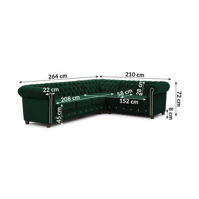 - cu tapițerie din catifeaExtensibilChesterfieldCu colț pe partea dreaptă/în formă de ”L”VerdeRezistent la apă/rezistent la peteCu 4 locuriLățime 264 cm