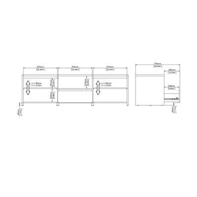 Culoarea albă combinată cu aspectul de stejar creează un efect elegant. Cu dimensiuni de 179x52x48 cm, aceasta oferă spațiu suficient pentru televizor și alte echipamente. Rafturile reglabile și un sistem integrat de gestionare a cablurilor asigură funcționalitate maximă. Această comodă este alegerea ideală pentru interioarele moderne în care stilul și funcționalitatea sunt combinate.