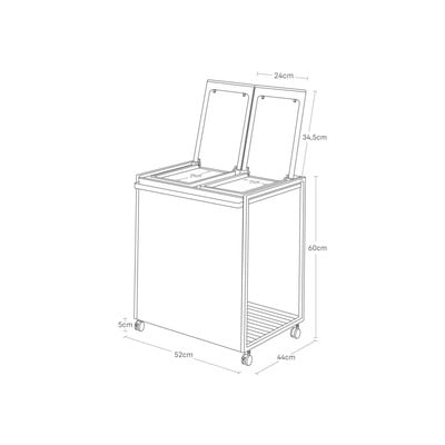 Coșul de gunoi din două părți este un ajutor practic în sortarea deșeurilor. Este dotat cu roți pentru o manevrare ușoară. Structura metalică are capace rabatabile din plastic, ramă pentru agățarea a doi saci și o secțiune acoperită în față, pentru a păstra deșeurile ascunse. Poți utiliza raftul inferior pentru a depozita sacii de rezervă și pentru a-i ține la îndemână.