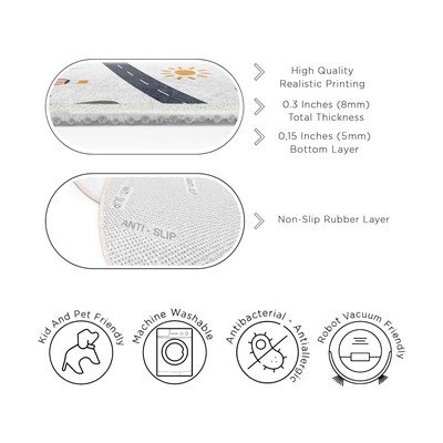 Covor de joacă pentru copii, lavabil, World Around Me de la Mila Home. Stimulează imaginația copiilor prin modelul său cu oraș și drumuri, fiind, de asemenea, ușor de întreținut.
