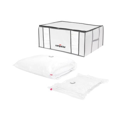 Excesul de aer este aspirat în mod convenabil cu aspiratorul de acasă. Datorită supapei unidirecționale, nu trebuie să îți faci griji cu privire la umflarea din nou a sacului după ce aerul a fost aspirat. De asemenea, are ferestre transparente pentru identificarea ușoară a conținutului și curele integrate cu cordon pentru depozitare chiar și în poziție verticală.