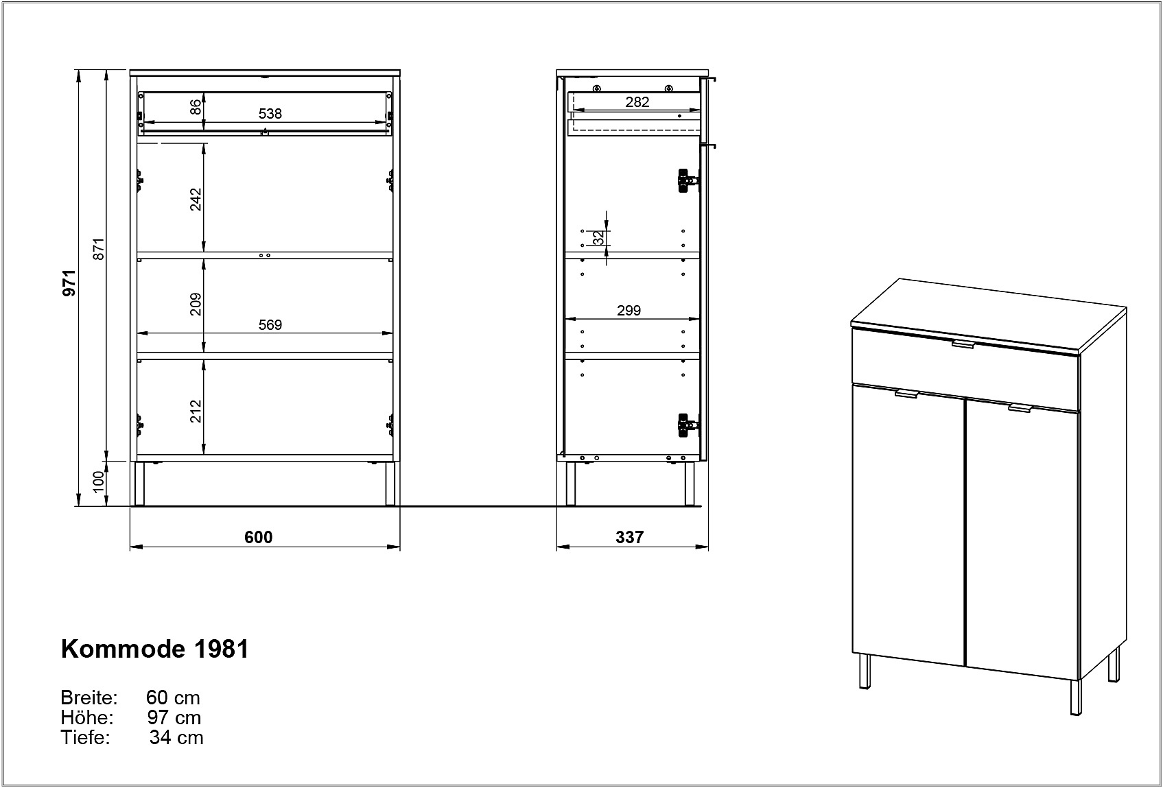 Dulapul este echipat cu un sertar cu o capacitate de încărcare de până la 10 kg și două uși, în spatele cărora se află două rafturi reglabile, fiecare cu o capacitate de încărcare de până la 10 kg.