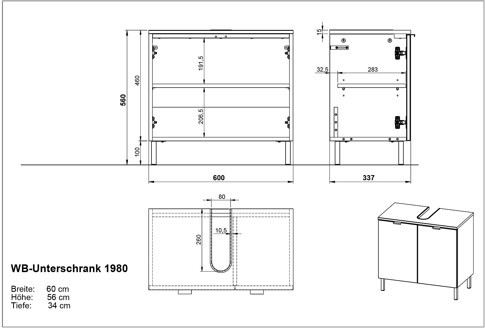 Dulapul este echipat cu două uși și un raft reglabil cu o capacitate de încărcare de până la 10 kg. Raftul superior are o decupaj pentru un sifon și poate susține până la 3 kg, în timp ce raftul inferior poate susține până la 10 kg. Dulapul stă pe patru picioare din metal negru și are mânere din metal negru.