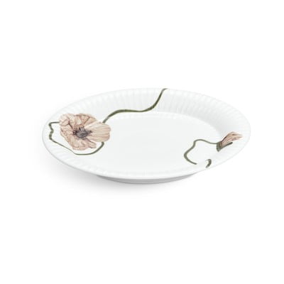 O farfurie de porțelan de mică adâncime cu un desen fin, cu maci, este ideală pentru un prânz liniștit în familie.