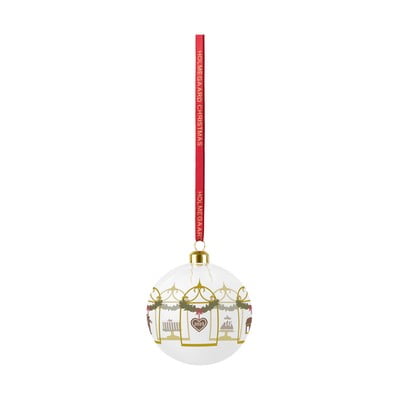 Decorațiunea este realizată din sticlă suflată manual și este completată cu o panglică de mătase roșie.