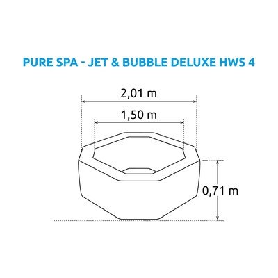 În pachet vei găsi, de asemenea, două blocuri de distribuție a apei, o husă termoizolantă, un încălzitor, un sistem de filtrare, o duză pentru pompă, trei inserții de filtrare, o placă izolatoare, un furtun de umflare, o pungă, un mic plutitor pentru minitarte de piscină, un tester de clor, pH și alcalinitate și un cablu de alimentare de 5 m. Cada nu poate fi conectată la un încălzitor solar, la un clorator sau la o filtrare cu nisip.