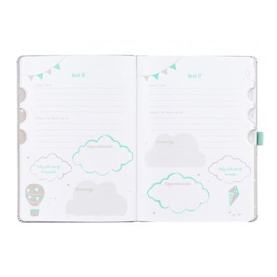 Jurnalul este împărțit în 4 părți: jurnal, planificator, plan de naștere și primele zile după naștere. Acesta va servi drept ghid pentru sarcina dumneavoastră, în care vă puteți înregistra etapele importante și controalele medicale de la 4 săptămâni de sarcină până la naștere.