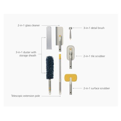 Setul de curățenie CleanTech de la brandul Joseph Joseph este un ajutor practic, format din șase piese, pentru întreaga locuință. Datorită tijei telescopice, care este reglabilă între 61 și 86 cm, vei ajunge cu ușurință chiar și în locurile mai greu accesibile. Setul include o perie 2 în 1 pentru gresie, cu dimensiunile de 10 x 7 x 31 cm, care are un cap rezistent pentru suprafețe mari și o perie interioară detașabilă cu peri în formă de V pentru curățarea în profunzime a rosturilor. Nu lipsește nici peria de detaliu 3 în 1, cu dimensiunile de 5 x 3 x 18 cm, ideală pentru curățarea în spații înguste. Aceasta oferă peri plați pentru suprafețe mici, peri în formă de V pentru rosturi și o racletă pentru calcar. Pentru curățarea suprafețelor din sticlă, este inclusă o unealtă 2 în 1, cu dimensiunile de 10 x 6 x 36 cm. Aceasta are o lavetă din microfibră pe o parte și o racletă flexibilă din silicon pe cealaltă. Mânerul pliabil și orificiul pentru agățare facilitează depozitarea. De asemenea, în set vei găsi o unealtă 2 în 1 pentru suprafețe, cu dimensiunile de 17 x 3,5 x 18,5 cm, care are un cap dublu – o lavetă din microfibră pentru sticlă și gresie și un burete abraziv pentru murdăria persistentă. Această unealtă este compatibilă cu tija de extensie. Ultima piesă este o lavetă de praf 3 în 1 cu husă de depozitare, având dimensiunile de 8 x 4 x 53 cm. Aceasta are o parte din microfibră fină pentru suprafețe plane și o parte cu "dreaduri" pentru curățarea suprafețelor neregulate. În mâner este ascunsă o racletă pentru îndepărtarea prafului colectat. Toate uneltele sunt proiectate cu mânere moi pentru o prindere confortabilă.