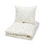 Lenjeria de pat Dreamland de la Cam Cam Copenhagen este fabricată din bumbac organic moale, cu o țesătură satinată și are certificare GOTS. Este decorată cu un motiv delicat care prezintă baloane cu aer cald, nori, stele și zmee zburătoare, creând o atmosferă de vis.