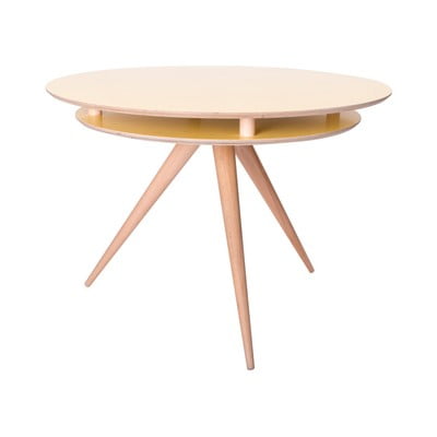 Picioarele mesei sunt fabricate din lemn de fag, contrastând discret cu nuanțele vii ale blatului dublu. Masa se livrează neasamblată, dar nu vă faceți griji, este foarte ușor de montat. Măsuța are o înălțime de 75 cm și un diametru de 105 cm .