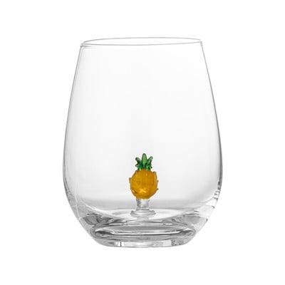 Acest pahar unic de 560 ml este suflat manual și decorat cu un ananas pe fund. Datorită faptului că este lucrat manual, pot apărea mici variații, ceea ce face fiecare piesă unică.