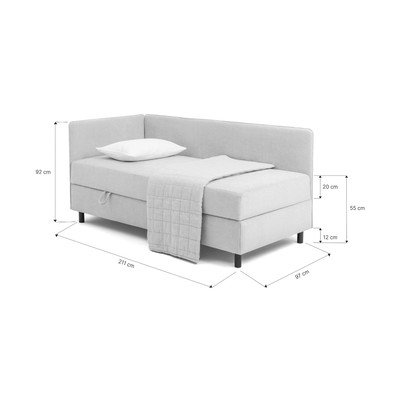 Pat de o persoană cu saltea cu arcuri pocket, spațiu practic de depozitare cu deschidere laterală și o tăblie variabilă care poate fi amplasată pe partea stângă sau dreaptă. Asamblarea extrem de ușoară, materialele de înaltă calitate, durabile și capacitatea mare de încărcare îl fac alegerea ideală pentru confortul de zi cu zi, în interioarele elegante.