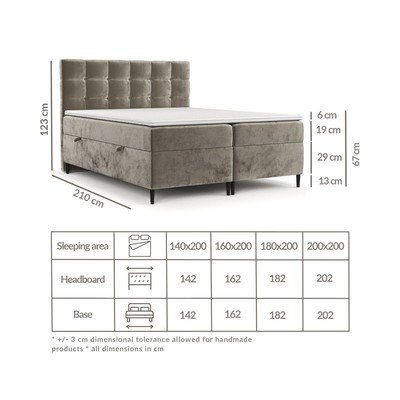 Acest pat cu arcuri boxspring combină o saltea de înaltă calitate din arcuri Bonell și spumă poliuretanică și un topper cu două fețe din spumă poliuretanică elastică. Topper-ul nu numai că aduce un confort sporit în timpul somnului, dar protejează în mod fiabil salteaua de deteriorare și murdărie. Husa sa detașabilă cu extract de alge poate fi îndepărtată în orice moment și spălată la o temperatură de până la 40 ⁰C.