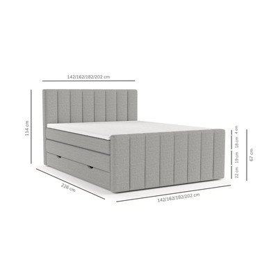 Acest pat boxspring oferă un confort inconfundabil datorită celor două tipuri de saltele. În timp ce salteaua inferioară, cu o înălțime de 19 cm, este alcătuită din arcuri bonell și spumă poliuretanică, salteaua superioară detașabilă, cu o înălțime de 18 cm, este alcătuită din arcuri cu buzunare plasate în buzunare individuale.