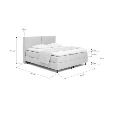 Patul boxspring include o saltea cu arcuri pocket de 20 cm și un topper din spumă PUR de 5 cm înălțime, asigurând confort și o suprafață de dormit mai înaltă.