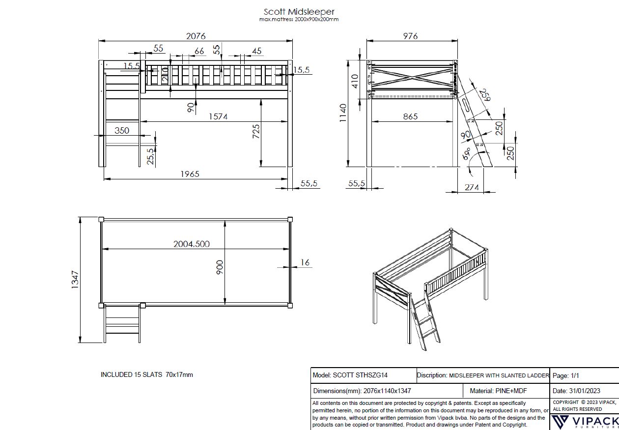 Patul SCOTT combină un pat supraetajat de 90 x 200 cm, o bibliotecă asortată și un birou. Datorită funcționalității sale, este deosebit de potrivit pentru camerele cu spațiu limitat.