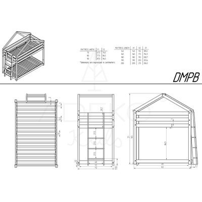 Pat pentru copii DMPB- 90x200 cm, de tip casă/supraetajat/cu extensie suplimentară, cu spațiu de depozitare, cu somieră, din lemn de pin, finisaj suprafață: netratat/finisaj suprafață: șlefuit, în culoare naturală