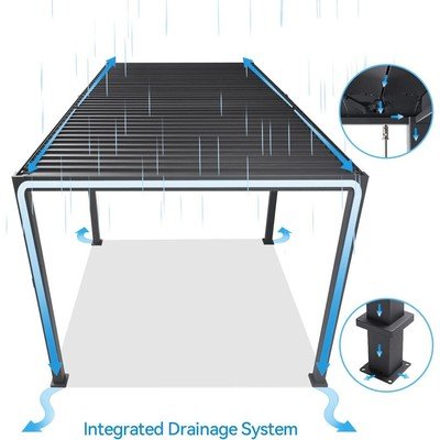 Lamelele pot fi rotite manual de la 0° la 135° cu ajutorul mânerului. Nu trebuie să vă faceți griji că veți deteriora structura pergola atunci când rotiți lamelele. În caz de ploaie, apa este drenată printr-un sistem de drenaj unic, integrat direct în structură.