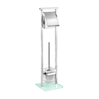 Combinație practică de perie de toaletă și suport pentru hârtie igienică. Materialele folosite - metal combinat cu sticlă - sunt o idee bună în ceea c...