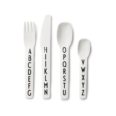 Tacâmuri pentru copii- 4 buc., din plastic, alb, 1x lingură/1x furculiță/1x cuțit/1x linguriță de ceai