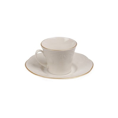 Serviciu drăguț cu o notă de istorie. Porțelan de înaltă calitate, în culori discrete, cu o dungă aurie de lux