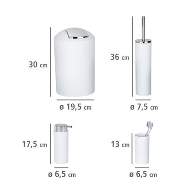 În set vei găsi un suport pentru periuța de dinți, un dozator de săpun cu pompă, un coș de gunoi cu un volum de 6,5 litri și o clapetă practică pentru golire, precum și un set de perie WC și cap înlocuibil, cu o lățime de 6,5 cm. Peria are peri flexibili din plastic care curăță eficient și nu zgârie vasul de toaletă.