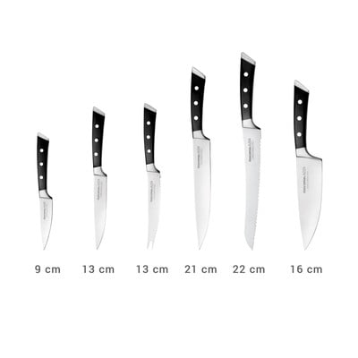 Cuțitele Azza sunt forjate din oțel inoxidabil japonez, ceea ce conferă lamei durabilitate și ascuțime. Mânerul de formă ergonomică cu nituri solide asigură o manevrare confortabilă. Întregul set este completat cu un bloc pentru o depozitare sigură și comodă.