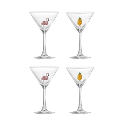 Setul include două piese cu motiv flamingo și două cu motiv ananas. Fiecare pahar este unic datorită faptului că este suflat manual. Paharele sunt ideale pentru servirea cocktailurilor.