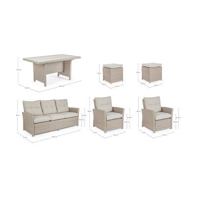 Setul Ariel oferă suficient spațiu pentru așezarea confortabilă a până la șase persoane. Canapeaua măsoară 186,5 x 76 x 89 cm, fotoliile 145,5 x 85,5 x 69,5 cm și scaunele 42 x 42 x 40 cm. Masa de 76 x 75,5 x 89 cm oferă suficient spațiu pentru gustări și băuturi.