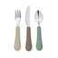 Setul include o lingură, o furculiță și un cuțit. Tacâmurile sunt fabricate din oțel inoxidabil și completate de mânere ergonomice moi din silicon care sunt ușor de ținut. Partea de jos a mânerelor este decorată cu un model simpatic.