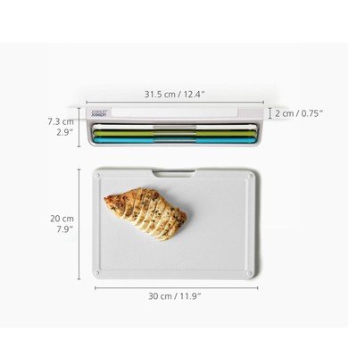 Dimensiunile setului sunt de 7,3 x 31,5 x 22,8 cm, iar tocătoarele sunt de 20 x 30 cm.