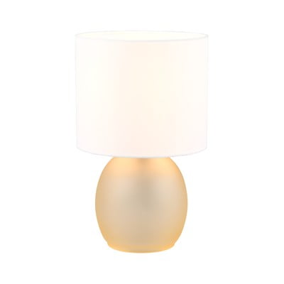 - cu abajur textil, din material textil/din sticlă, cu alimentare la priză, albă/aurie, înălțime 29 cm